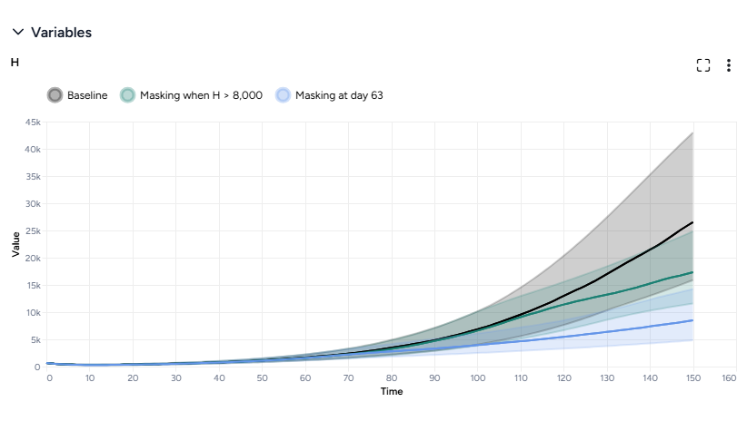 - Ensure hospitalizations (H) are below 10,000 at all timepoints in 95% of simulated outcomes.
