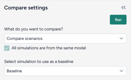 - Select Compare scenarios, choose the baseline dataset, and click Run.