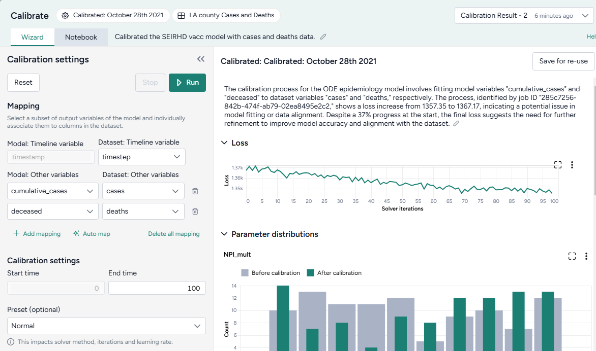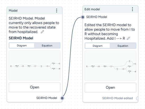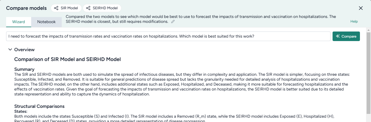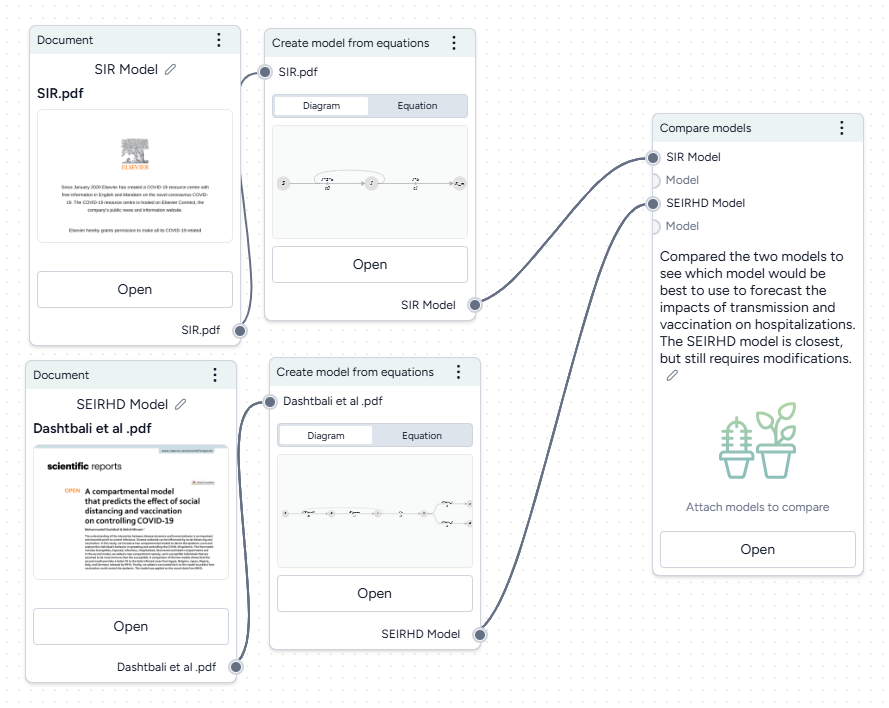 To understand the extracted SIR and SEIRHD models better and decide which one to use, we pipe them into a Compare models operator. This uses an AI assistant to create side-by-side model cards for each according to our modeling goal of reducing hospitalizations