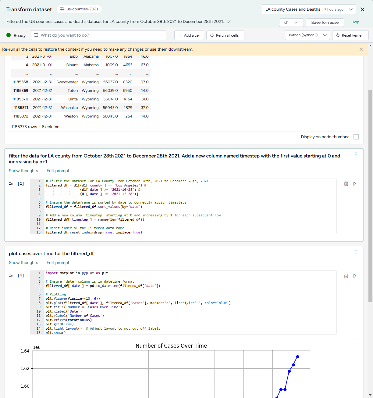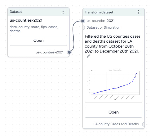 The uploaded dataset covers all of the U.S. for 2021. However, we're only interested in LA county. We can use Terarium's data transformation tools to filter down to just what we need.