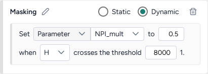 - On the other, create a new Dynamic intervention that sets Paramater NPI_mult to 0.5 when hospitalizations (H) cross the threshold of 8,000.