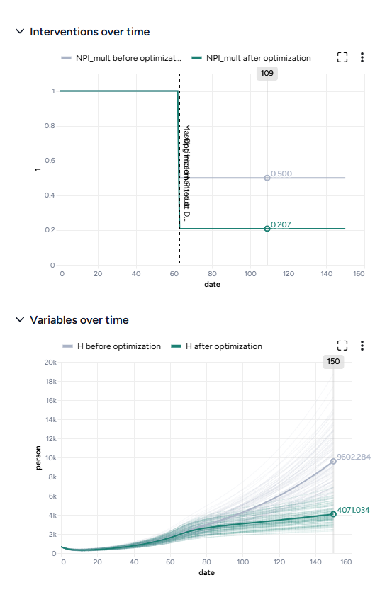 In Terarium, you can optimize interventions to meet specified constraints, allowing you to get answers to key decision maker questions faster. We want to find how effective masking needs to be to prevent hospitalizations from exceeding capacity.
