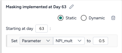 - On one policy, create a new Static intervention starting at day 63 that sets Paramater NPI_mult to 0.5.