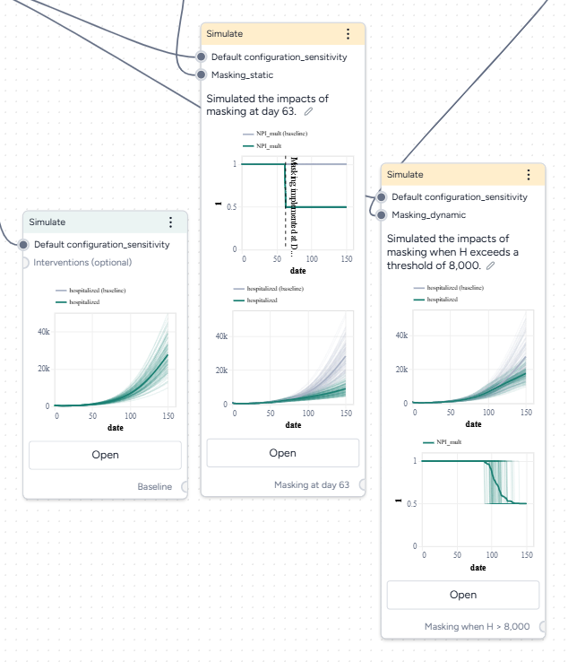Our sensitivity analysis showed us the infection rates we should aim for to reduce hospitalizations. Now we can create different masking intervention policies to visualize the impact of different what-if masking scenarios that might get us there. For this, we'll use parameter NPI_mult, which is a multiplier for the transmission rate.
