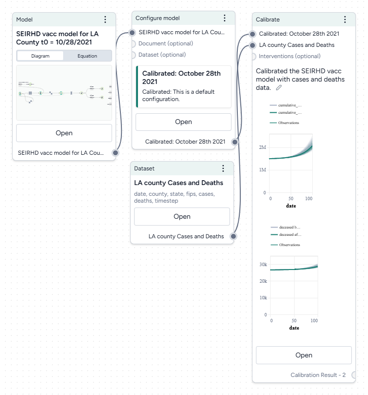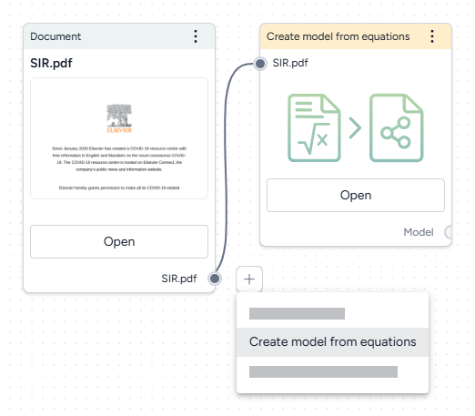 - Drag each document into the workflow canvas, hover over its output, click Link > Create model from equations, and then click Open.