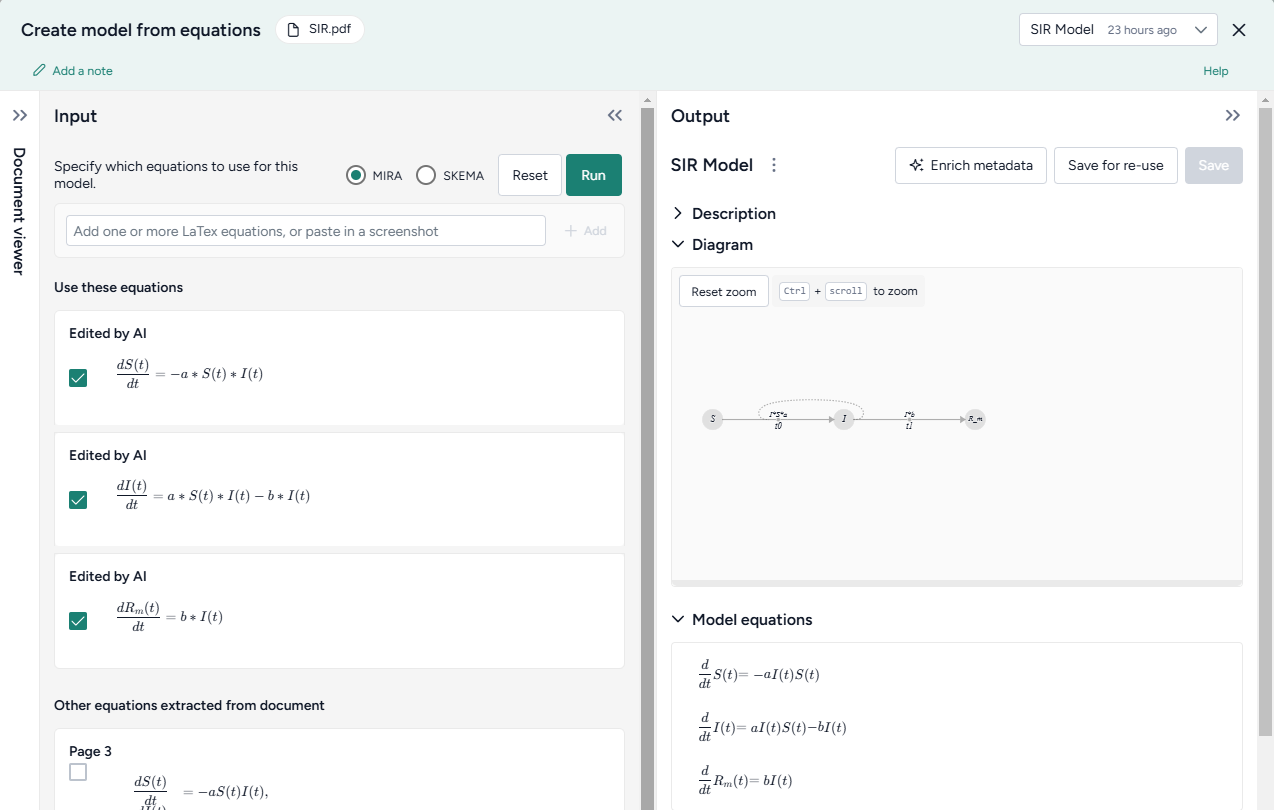 Terarium can automatically recreate a modelfrom a set of ordinary differential equations. In this case, we create models by extracting equations from the uploaded documents, but you could also get equations from pasted images or manually enter them as LaTeX.