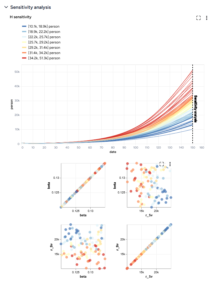 Next, we'll simulate our model configuration to perform a sensitivity analysis to explore the effects of infection rate (beta) and vaccination rate (r_Sv) on hospitalizations.