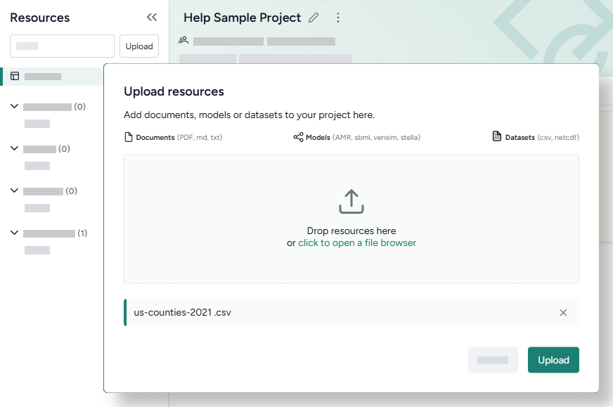 - Drag the dataset and document files into the Resources panel and then click Upload.