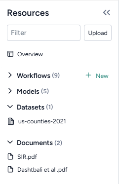 Begin setting up your project by uploading the models, papers (documents), and datasets you need for your modeling processes. In this case, that includes a dataset of U.S. COVID cases and deaths from 2021 and a set of papers describing different disease models.