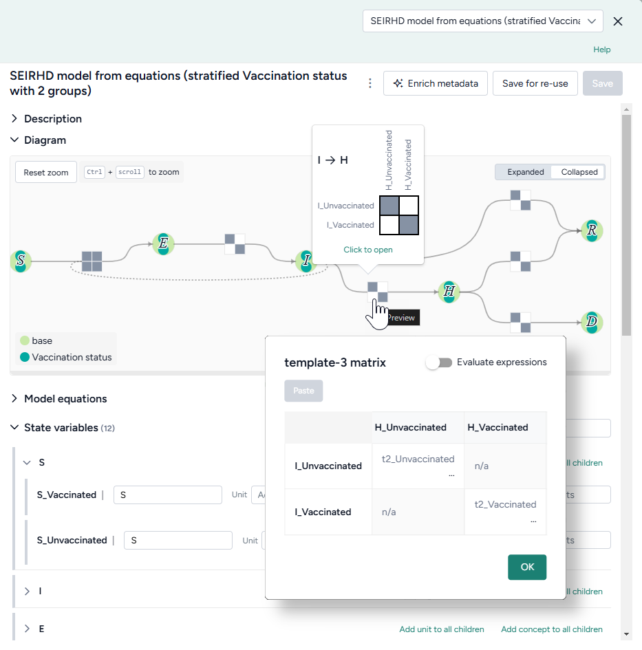- A list of stratified state variables, parameters, observables, and transitions.