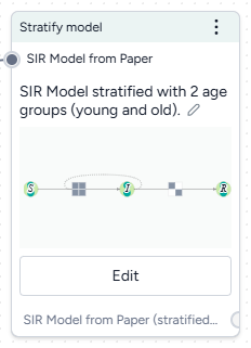 The notebook environment uses a structured data format to represent stratification operations. You can edit the code to have greater control over the transitions, interactions, and naming conventions for the stratified model.