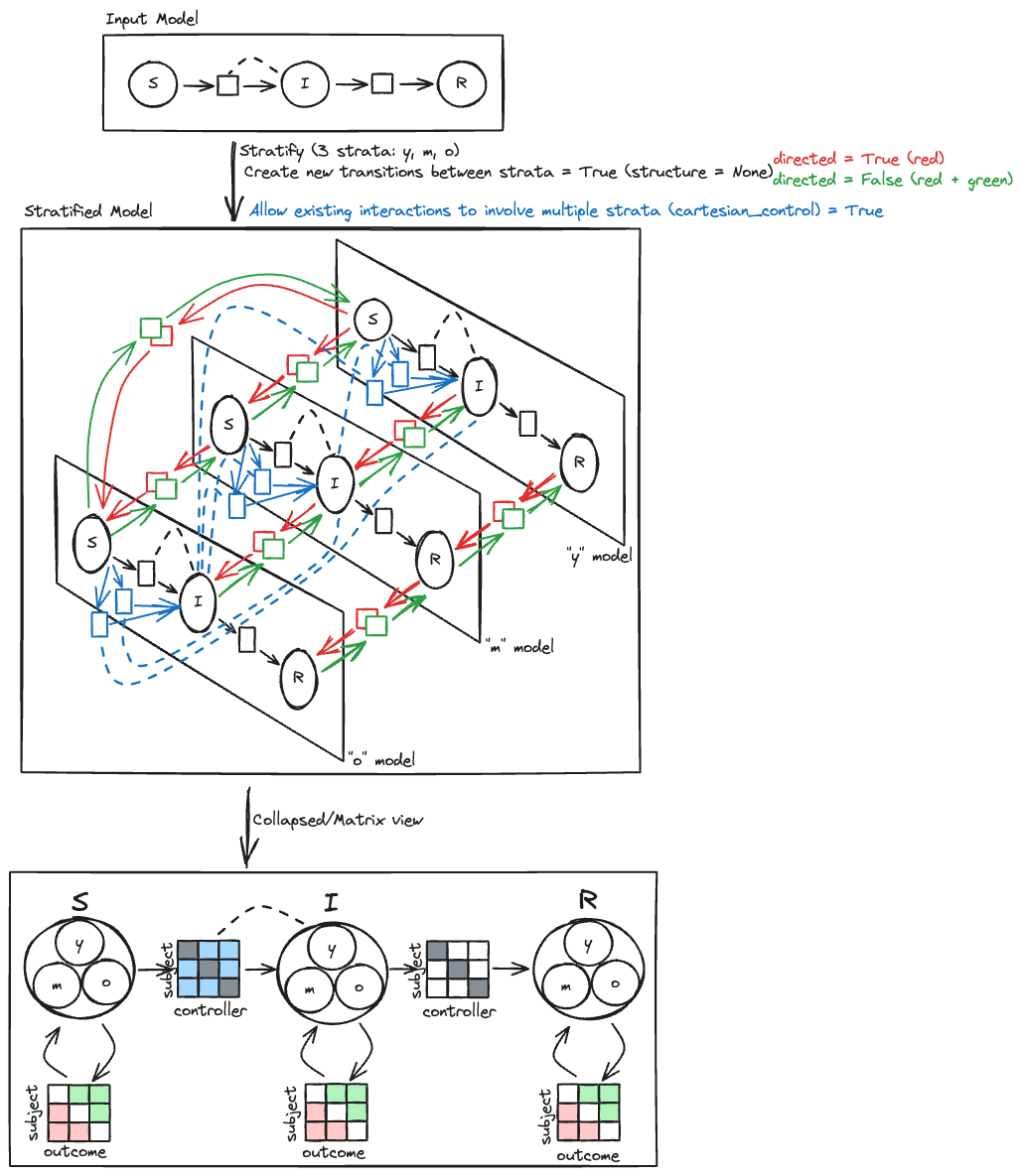 The following image shows how the transition and interaction settings apply to a simple SIR model stratified by y, m, and o: